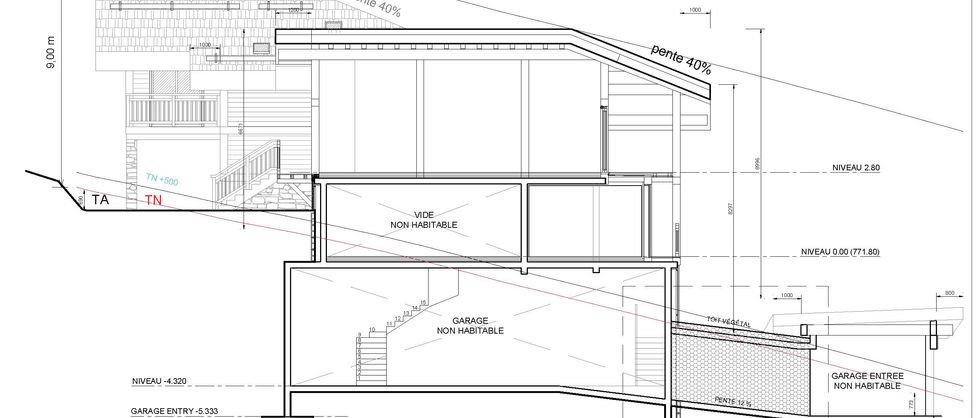 This chalet has four bedrooms with ensuite bathrooms, large open plan kitchen, dining and living area, ample storage areas and underground parking for four cars with inside turning space. This chalet is part of a five-chalet development explained in Project 18 and the design was based on the principles established during the design phase of the first chalet worked on for the five-chalet development (Project 24) where I devised a method for the mass and volume of the chalet which I named ‘sliding boxes’ – the principle being that box spaces could be stacked and stepped up the slope to create second or half levels, and split roof levels. The space underneath the habitable ‘sliding boxes’ created spacious garages for three or four cars plus turning space inside. This basic principle of levels and habitable spaces was used for all five buildings, although each design is unique. The main challenge for this chalet was that it was on one of the narrower plots and had a steep bank up from the road which made it difficult to design an easy vehicle access that complied with regulations. The final design incorporates a partially buried garage structure with a tunnel connecting the chalet to four underground parking spaces and creates large storage areas. *